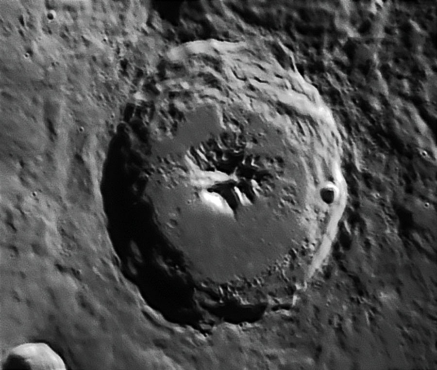 Avec ses remparts de 5000m. il est plus jeune que Cyrille en bas à gauche. La lune est gibbeuse croissante au moment de la prise, soit vers 5h00 du matin.