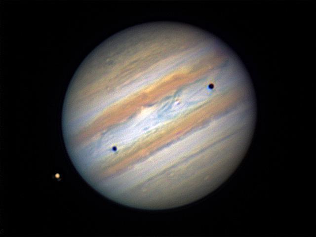 Ici, on voit Europa à gauche et Io, au centre, qui est difficile à voir . Les points noirs sont les ombres des deux lunes. L'ombre de Io à droite est plus volumineuse parce que la lune est plus près de Jupiter. Les deux lunes sont de dimension semblable.