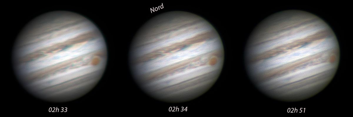 Ci-dessous, on remarque la rotation rapide de Jupiter sur elle-même, soit presque 10 heures à l'équateur.