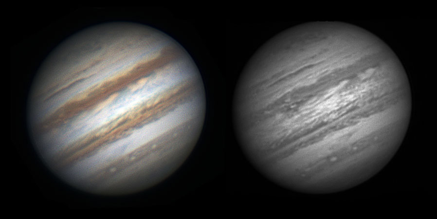 Début mai 2015, la terre s'éloigne de Jupiter, ce qui fait qu'elle a une taille apparente de 37 secondes d'arc comparée à 45 en février de la même année (gauche).