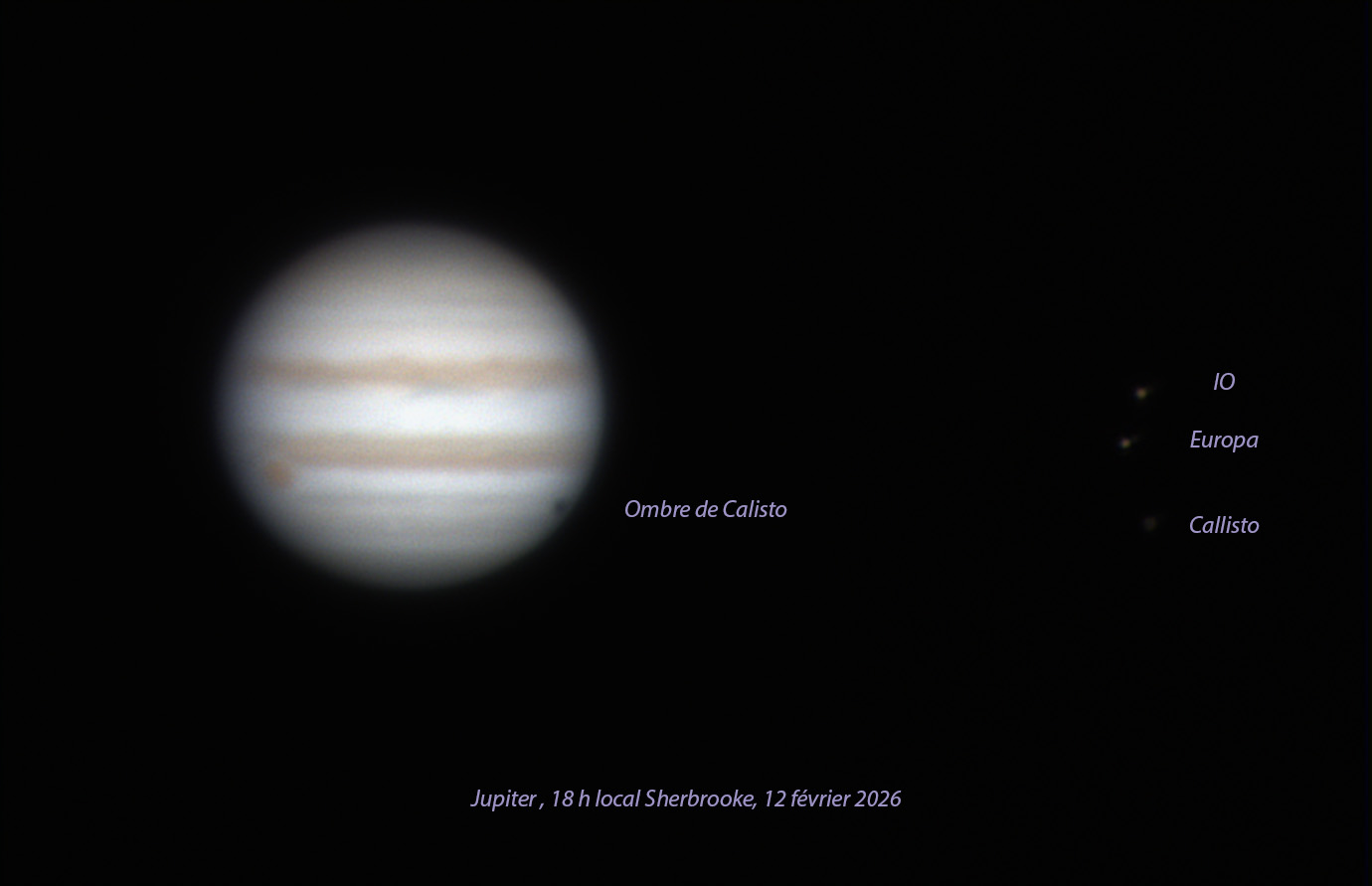 Série de photos prises au début 2016, Jupiter étant bien située dans notre ciel sherbrookois. Elle avait un diamètre apparent de 43 secondes d'arc, ce qui est moins que son maximum de 50.