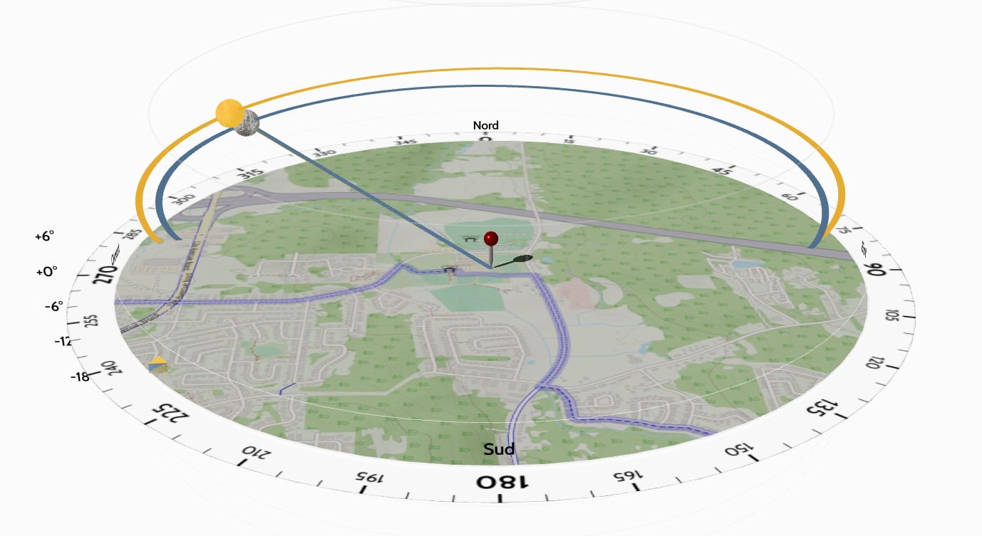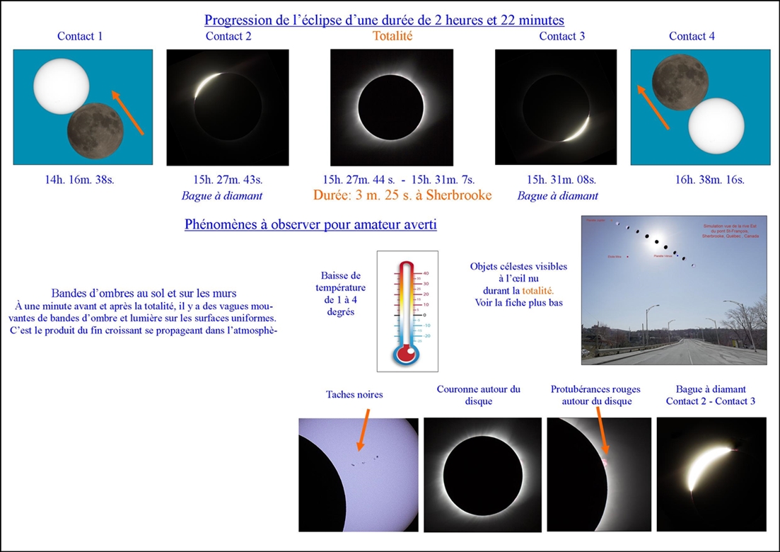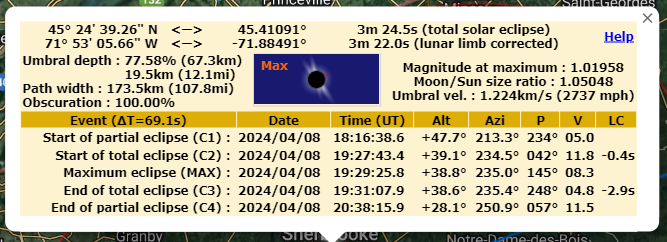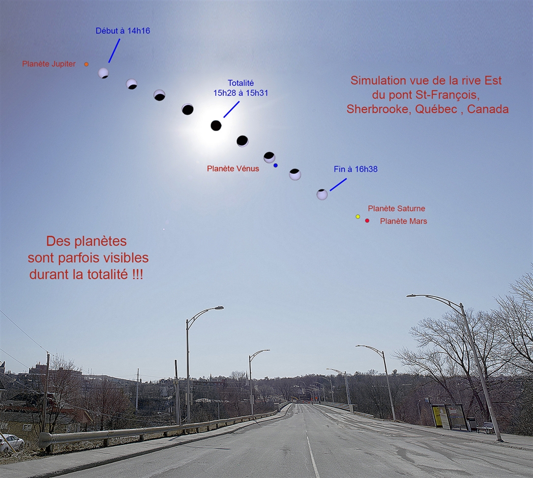 Positions du soleil et de la lune durant la totalité à Sherbrooke, Québec, Canada