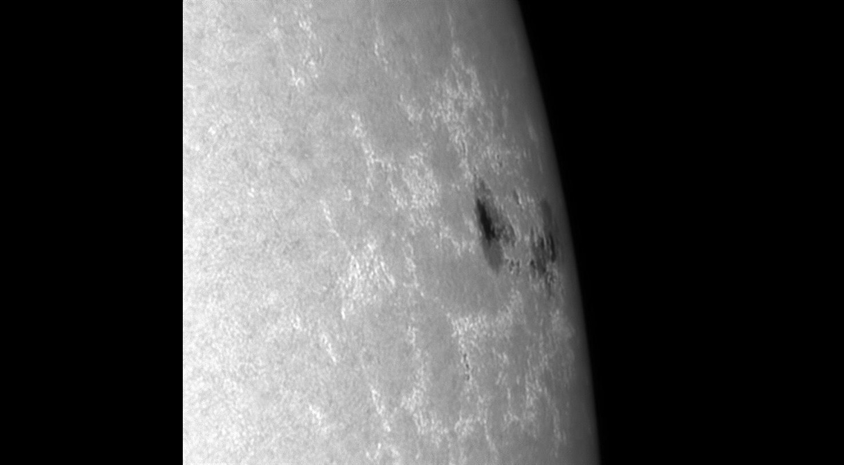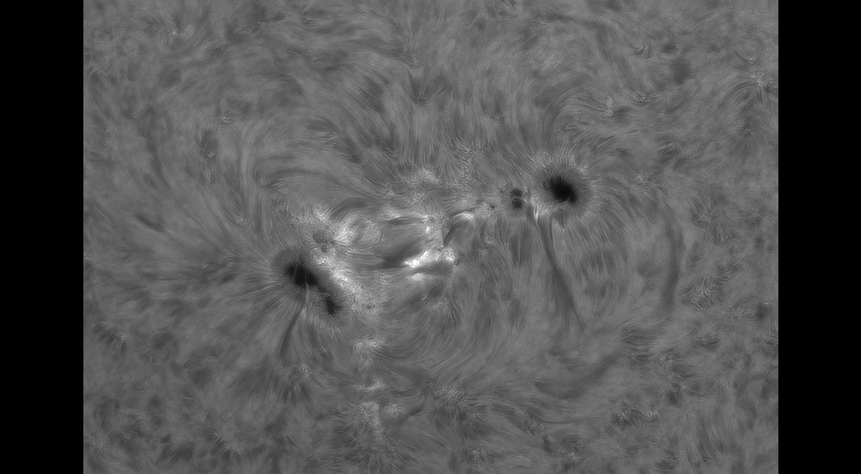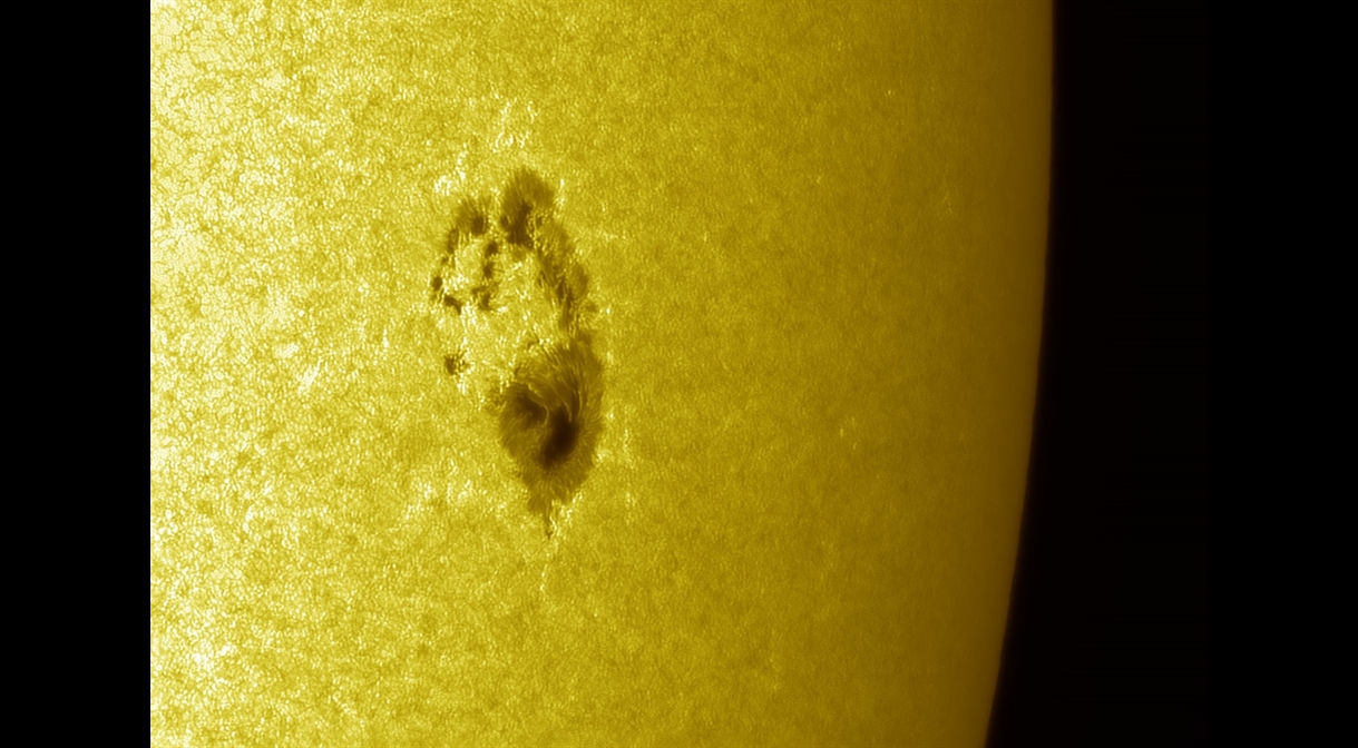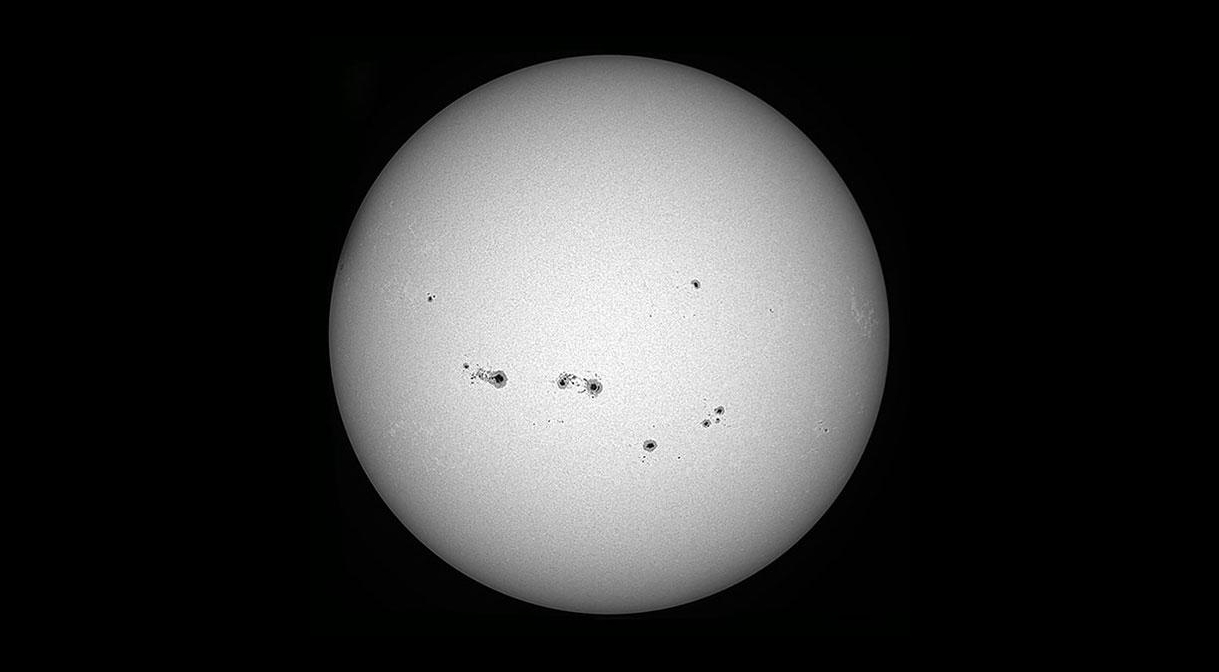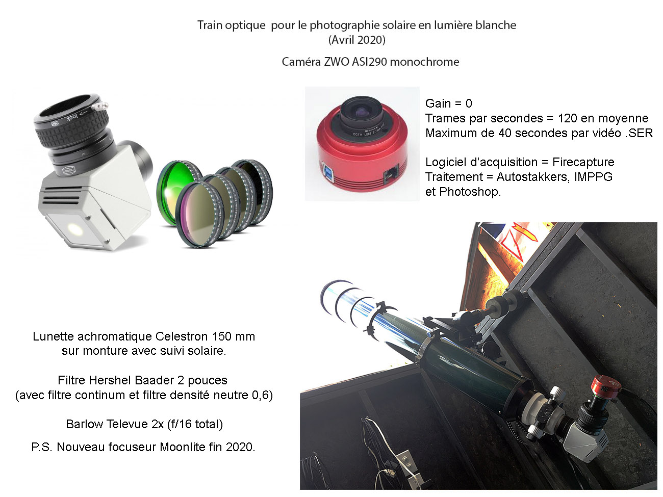La "lumière blanche" nous offre toutes les longueurs d'onde visibles du spectre solaire et on y voit la photosphère, soit la surface visible la plus profonde du soleil. On y voit des taches noires avec un filtre peu coûteux (Baader Astrosolar densité 5).