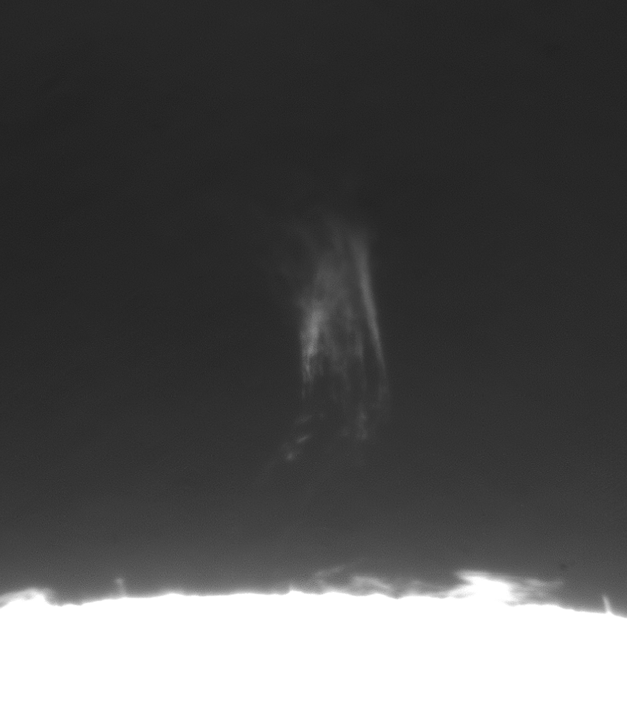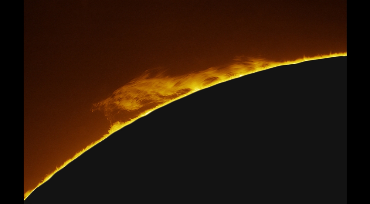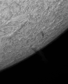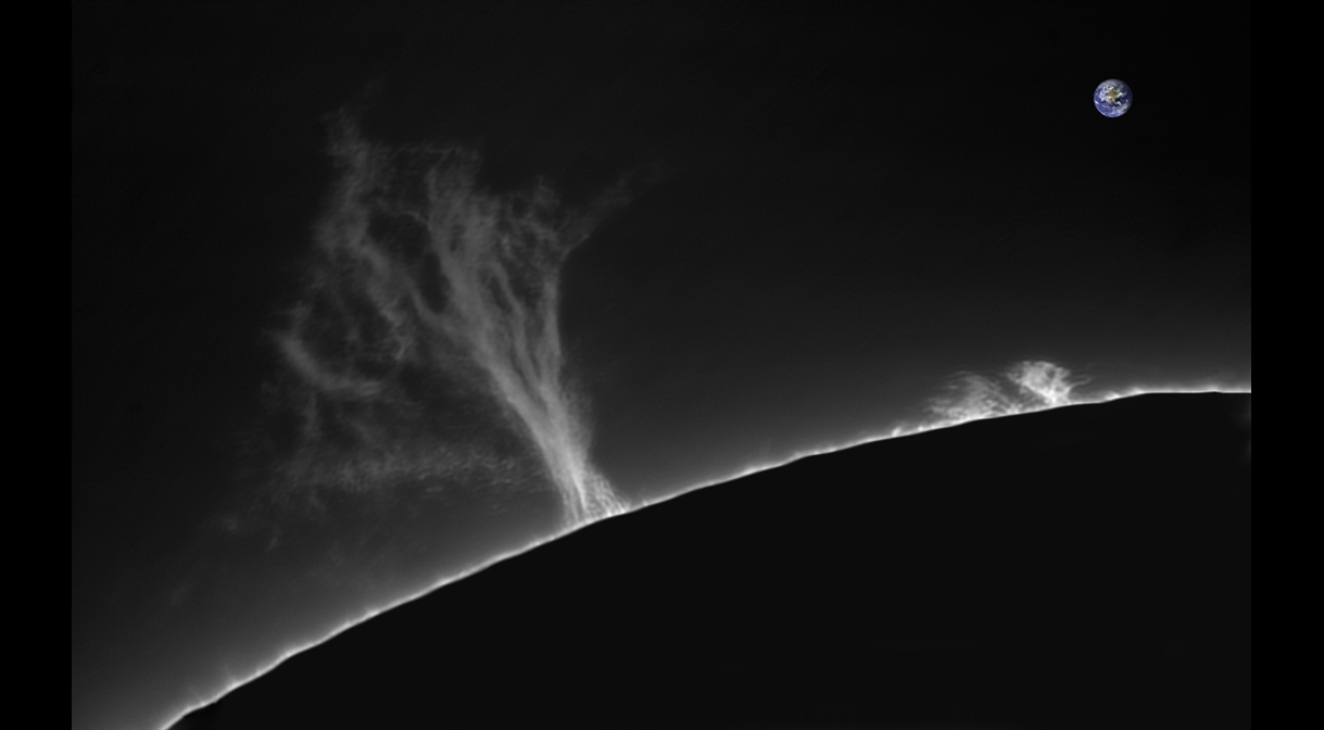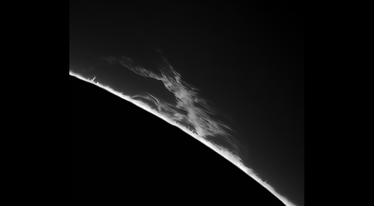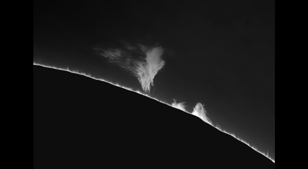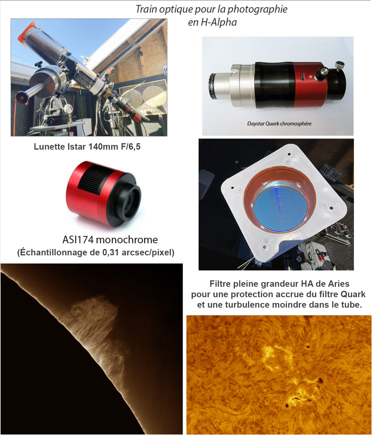 La ''lumière H-Alpha'' autour de 656 nm sur le spectre nous permet de voir les protubérances et la chromosphère en altitude, entre 100 et 2000 km, où les gaz très chauds sont perturbés par les champs magnétiques.